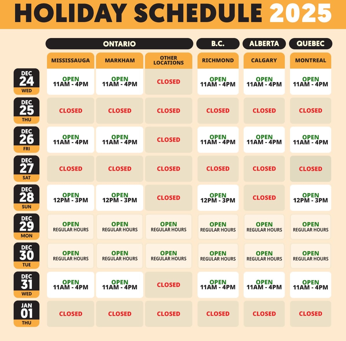 With Christmas and 2026 approaching, we want to inform you about our adjusted hours and schedule for all our locations. Below are the holiday hours across each of our many branches.